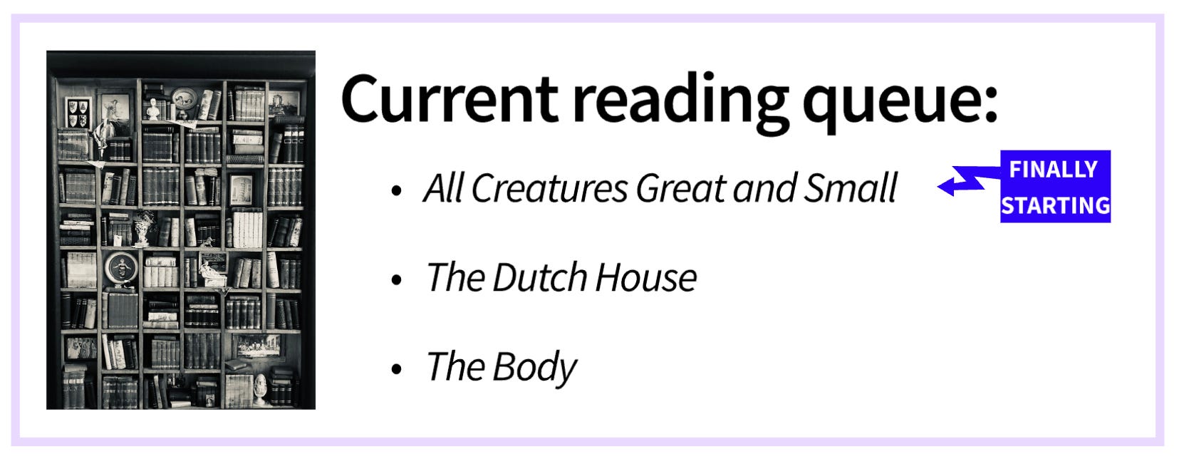 Confession: I only just finished The Thursday Murder Club so while I have no real data that this will stay with me for a while, I already love it. Four residents of a retirement village have formed a “Murder Club” to review unsolved police cases, when they suddenly find themselves in a murder investigation. SO charming. SO fun. SUCH a merry gang of crimebusters, with just enough graceful reminders of aging, loss, and love to give it a lot of heart. (Shout out to my friend and reader Danielle, the best source of cozy mysteries.)